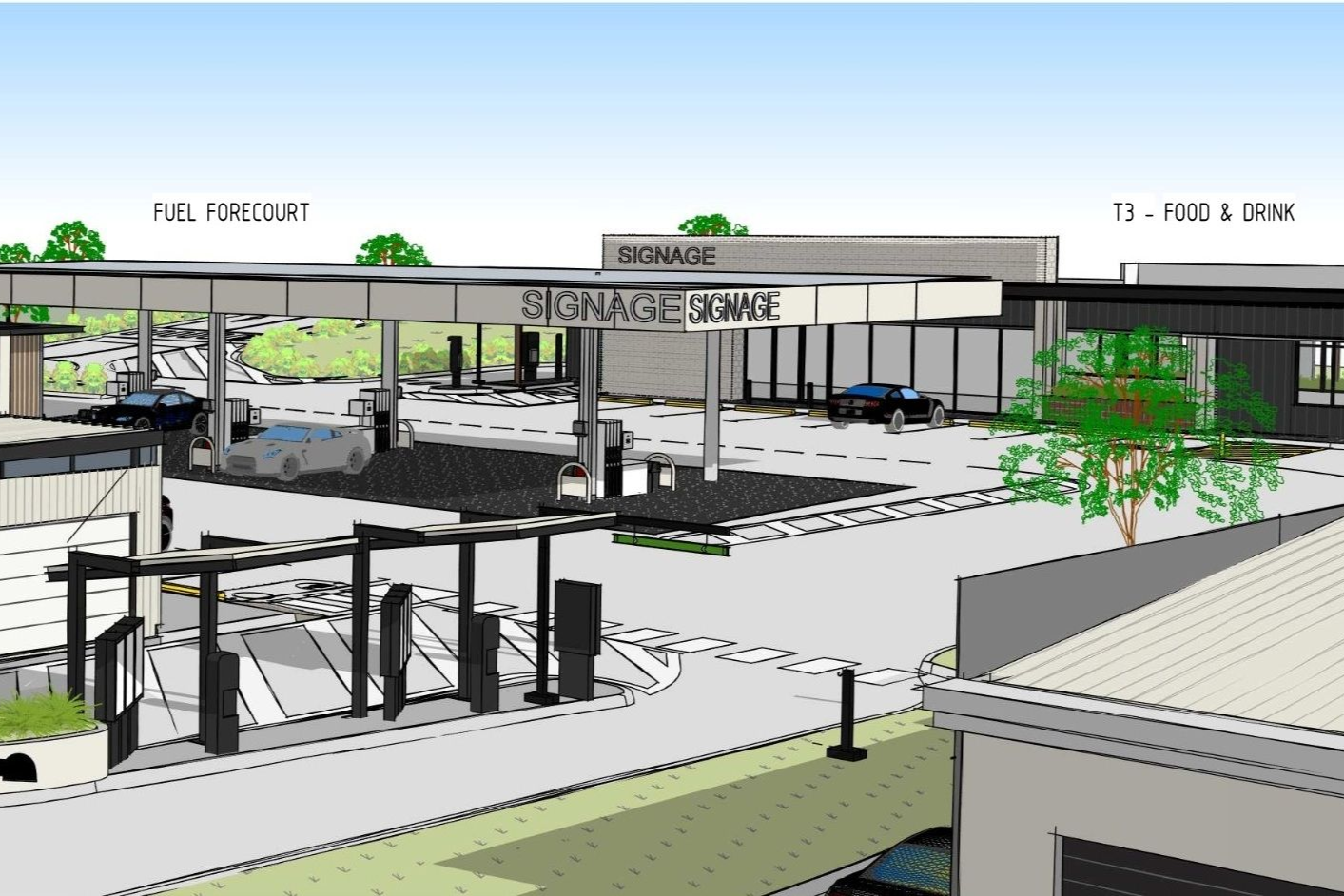 The service station will be adjoined to the south by one of the two food and drink outlets and includes a drive-thru facility. The outlet will also provide internal kitchen, food preparation, servery and customer dining areas. The second food and drink outlet will occupy a separate stand-alone building adjacent to the site’s primary road frontage and also includes a drive-thru facility. The outlet will also provide internal kitchen, food preparation, servery and customer dining areas.